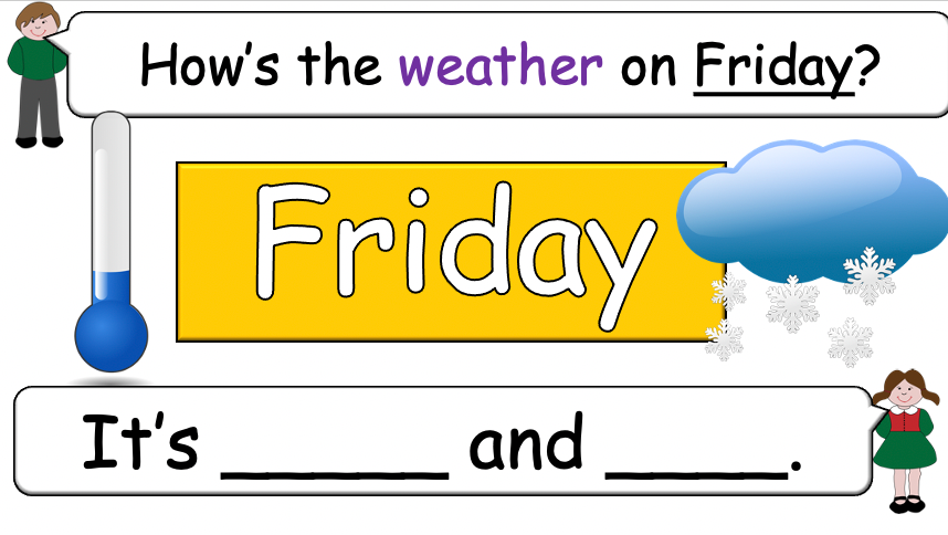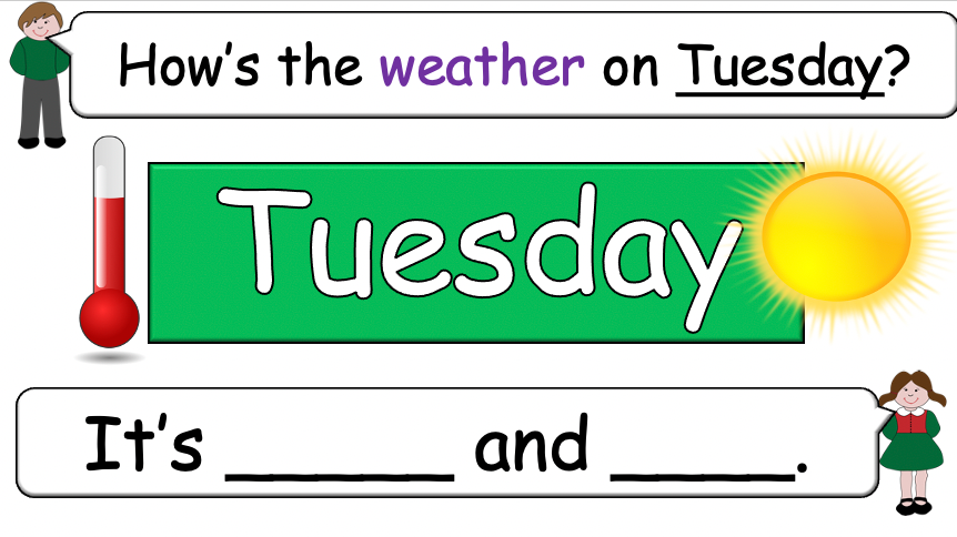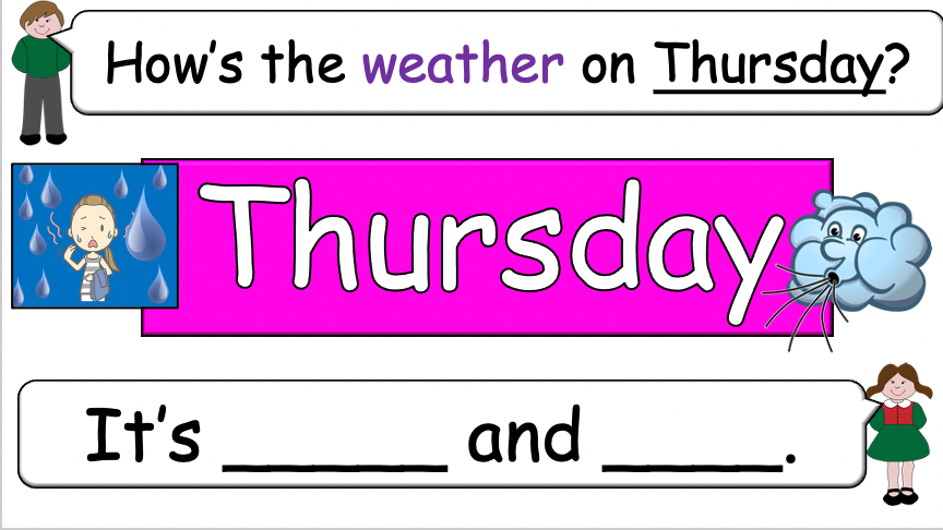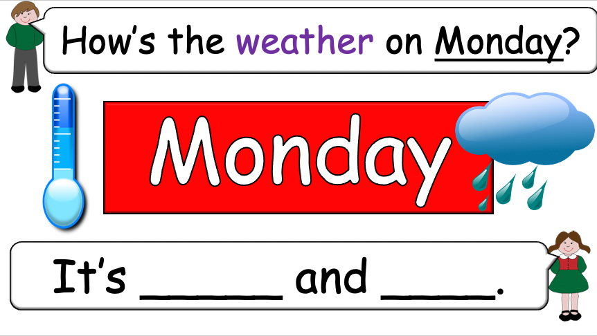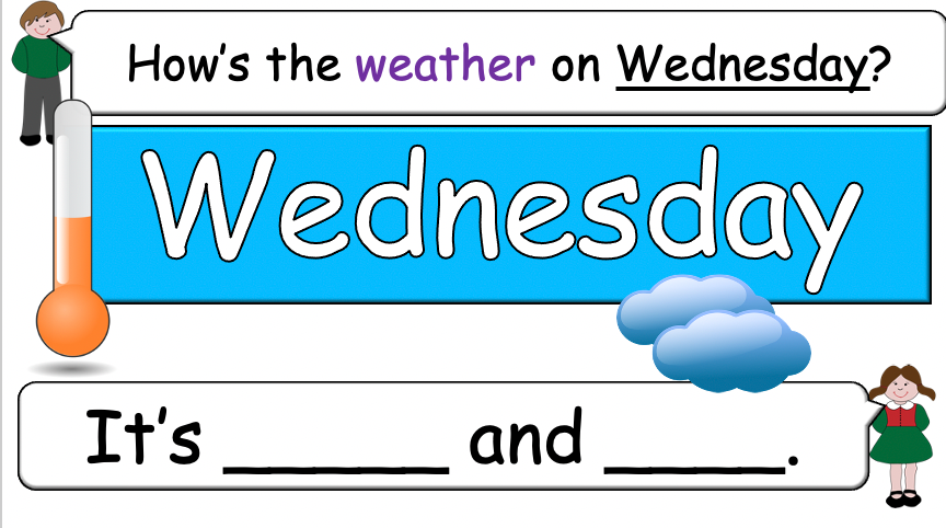 ✅ Days of the week and weather review (sunny, cloudy, windy, snowy, etc.)