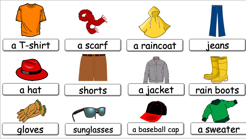 T-shirt, sweater, jacket, hat, scarf, jeans, shorts, rain boots, gloves, sunglasses, baseball cap, raincoat