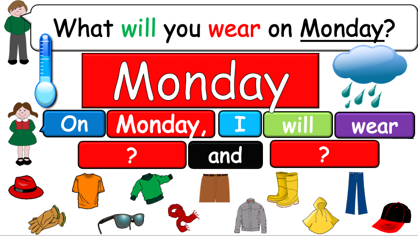 What will you wear on Monday? → I’ll wear a hat and a raincoat.