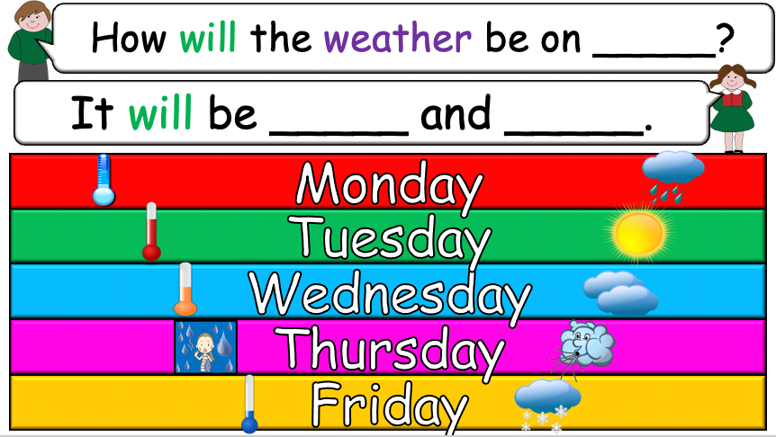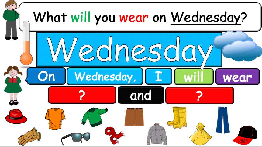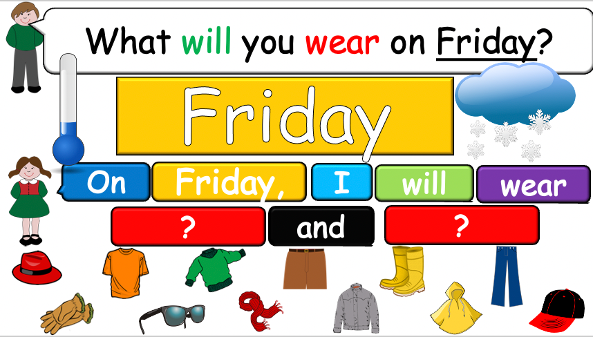 This fun and dynamic PowerPoint lesson reviews weather and clothing vocabulary while introducing students to future tense (“will”) for making predictions about what to wear. Students learn to connect weather conditions with appropriate clothing choices through visuals, guided examples, and speaking practice that builds both accuracy and fluency.