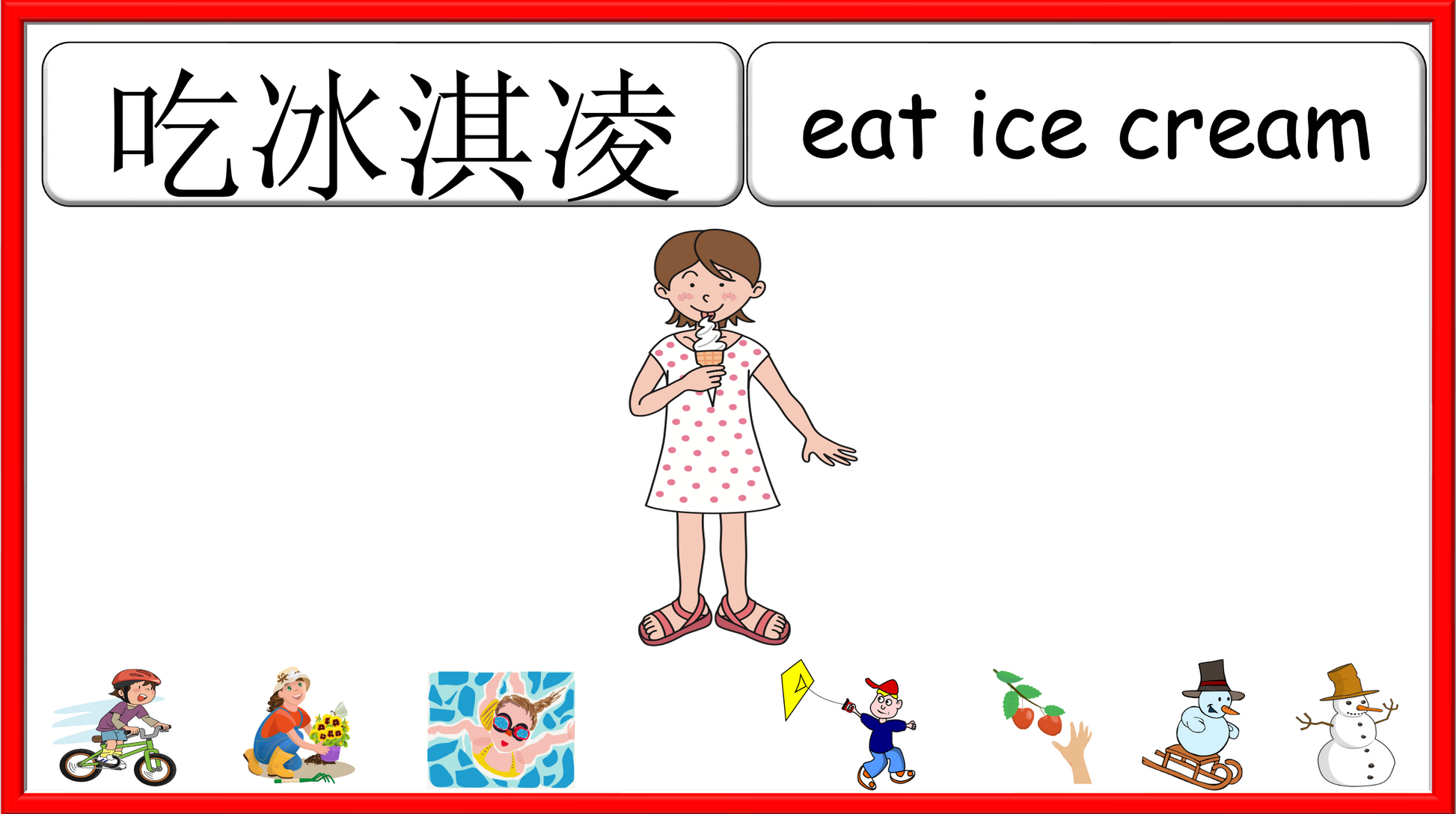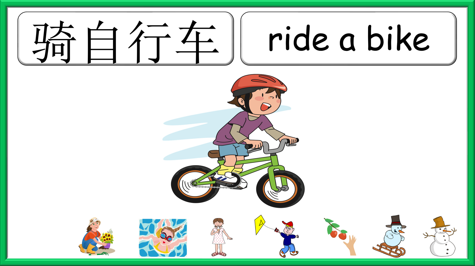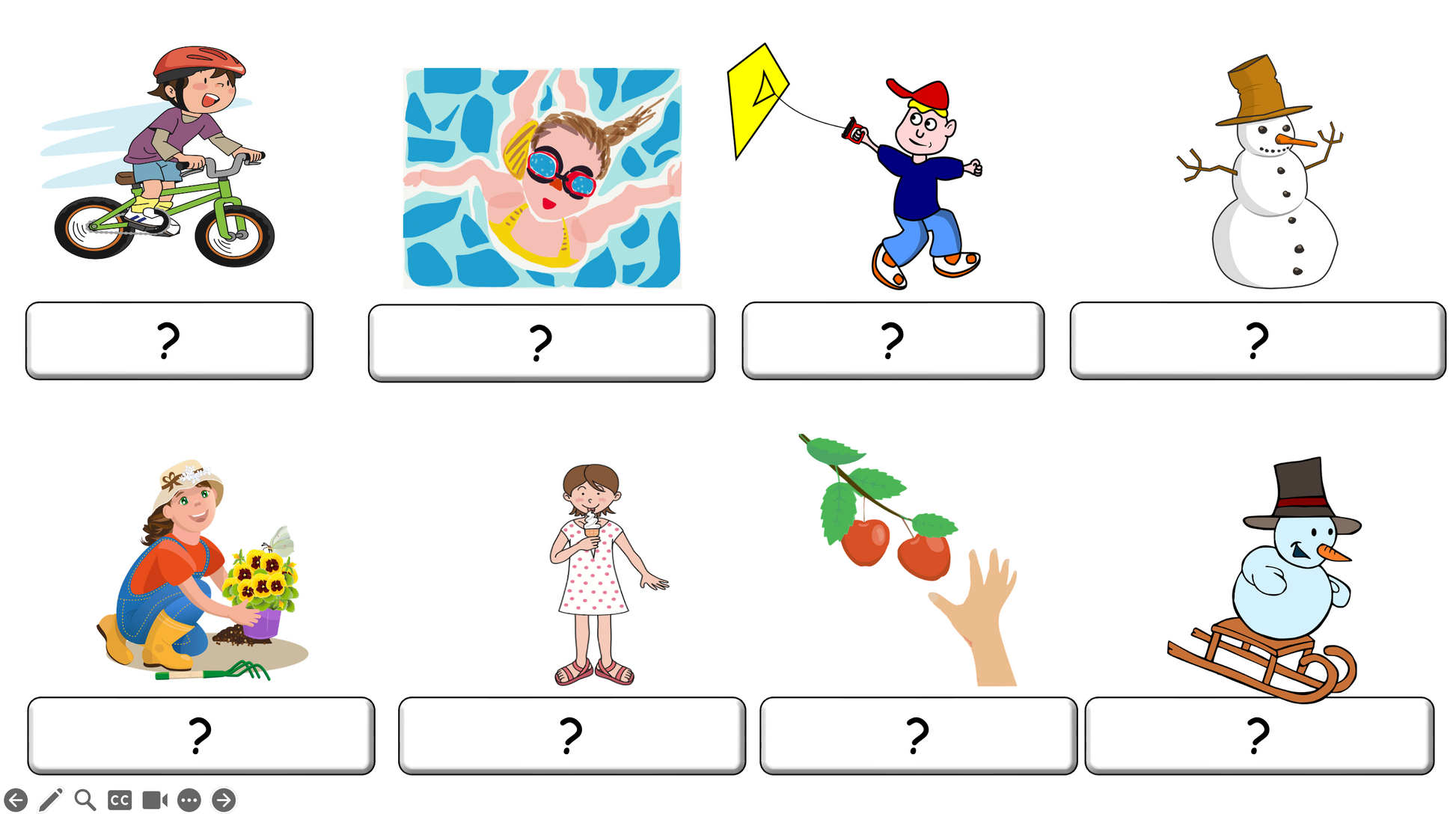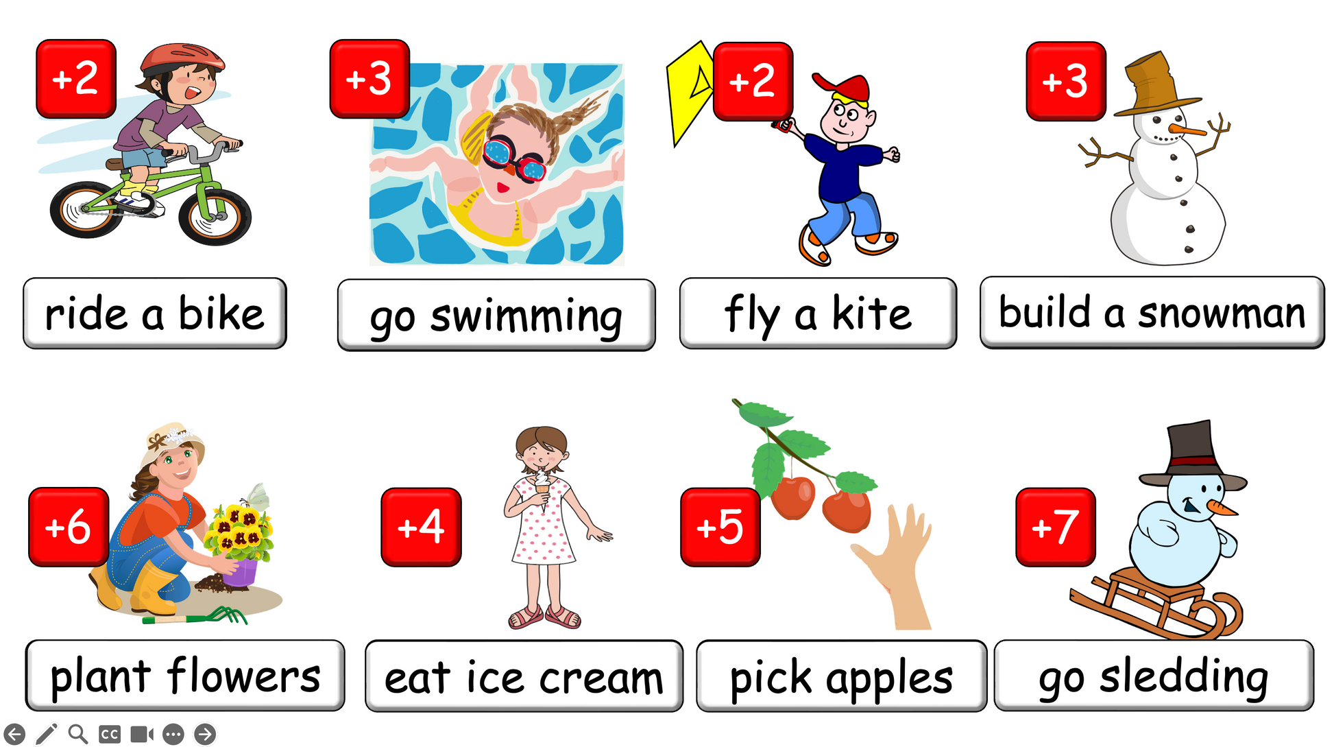 ride a bike, go swimming, fly a kite, build a snowman, plant flowers, eat ice cream, pick apples, go sledding