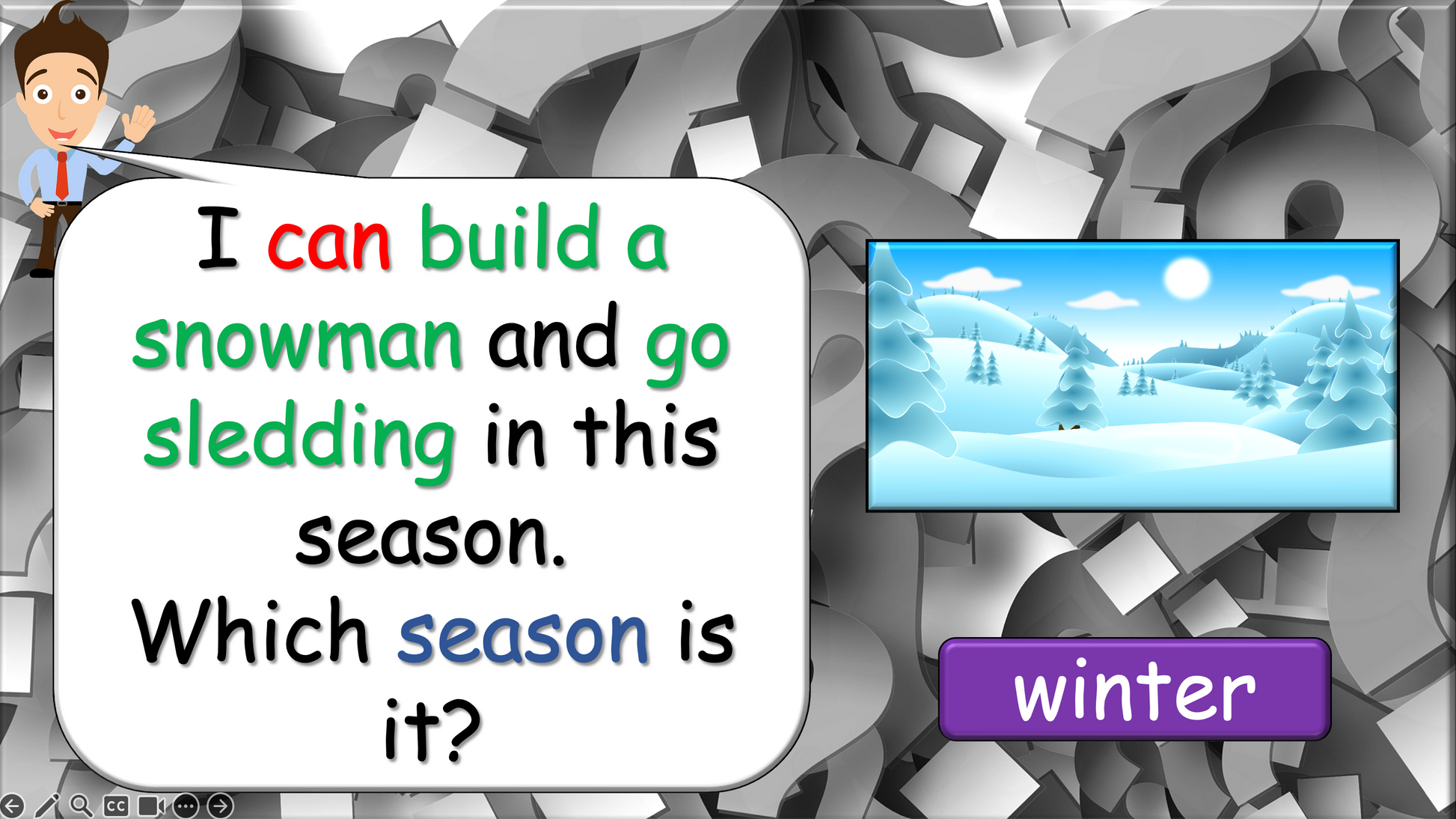 This interactive PowerPoint is designed for Grade 2–3 ESL students learning to connect seasonal weather and activities in English. Building on Seasons Part 1, this lesson introduces fun action vocabulary with total physical response (TPR) and speaking practice to help students use complete sentences naturally.