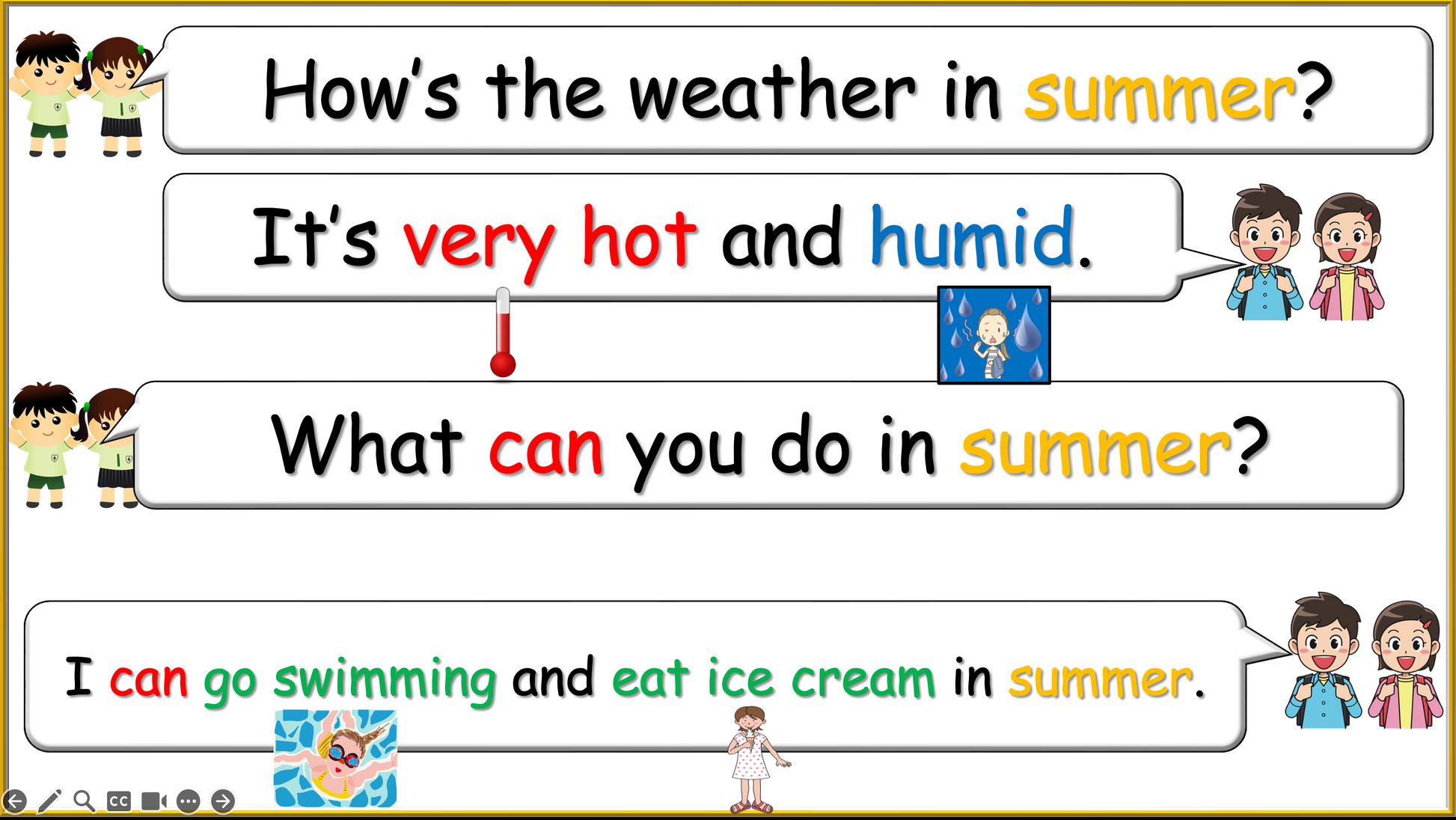 Review all four seasons and weather adjectives (cold, cool, warm, hot, windy, snowy, humid, nice)