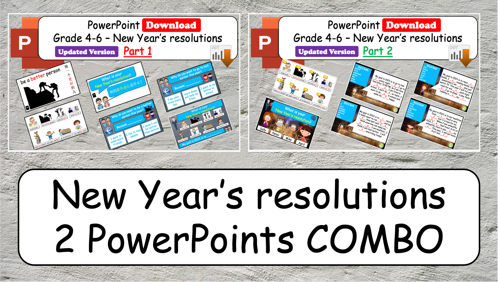 Grade 4-6 - ESL Lesson - New Year's resolutions - Part 1 and 2 COMBO Deal - 2 PowerPoint Lessons