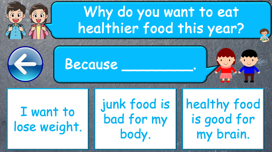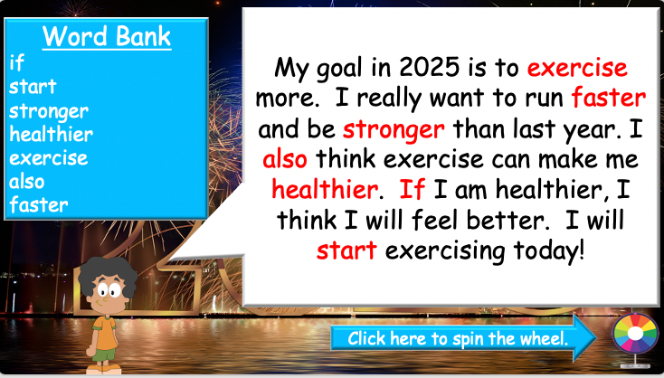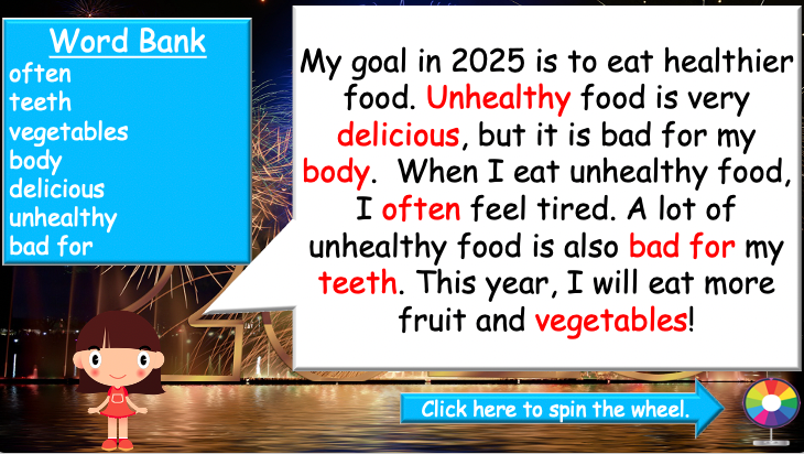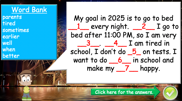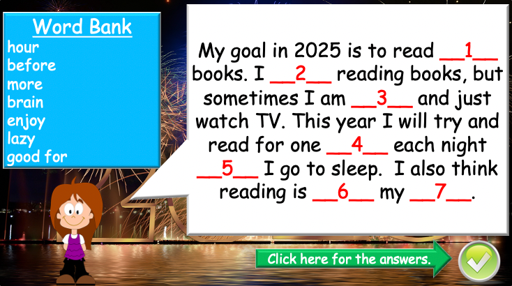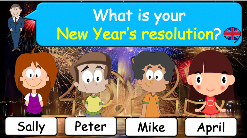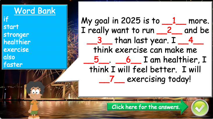 Continue building your students’ understanding of New Year’s resolutions with this interactive and engaging ESL lesson plan! This 40-minute lesson reviews key concepts from Part 1 while introducing new characters, a fill-in-the-blank activity, and a fun speaking game.