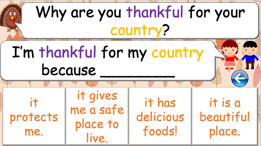 This interactive Thanksgiving lesson teaches students the meaning of the holiday, common foods, and how to express gratitude in simple English. Clear visuals, bilingual vocabulary support, and structured sentence frames help Grade 4 ESL learners understand and use “I’m thankful for…” confidently.